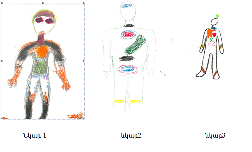 «Արտ-թերապևտիկ աշխատանքի գործընթացում մարդը գիտակցորեն կամ չգիտակցված կարող է արտահայտել հոգեսոմատիկ շատ նուրբ ֆենոմեններ՝ օգտագործելով մետաֆորիկ պատկերներ» [2; էջ22], – իրավացիորեն գրում է նշանավոր արտ-թերապևտ Ա․Կոպիտինը։ Ելնելով արտ-թերապևտիկ աշխատանքների մեր բազմամյա փորձից՝ առաջարկում ենք պրոյեկտիվ նկարի մի մեթոդիկա՝ «Մարդու ուրվագիծը․ տեղակայիր հույզերն ու զգացողությունները», որպես մարմնակողմնորոշիչ արտ-թերապիայի դիագնոստիկ միջոց։ Բազմաթիվ պրոյեկտիվ մեթոդիկաներ կան, որոնք վերաբերում են մարդու նկարին, և այդ մեթոդիկաները մեկնաբանվում են ավելի շատ հուզական չափանիշներով՝ մարդու նկարի ընդգծվածությունը, գլխի չափերը, նկարված կամ բացակայող մասերը և այլն ( Մահովերի թեստը, Գուդենաու-Հարիսի մեթոդիկան և այլն)։ Մեր առաջարկած մեթոդիկան վերը նշած ինտեգրատիվ մոտեցման փորձ է, որը նկարի միջոցով վեր է հանում հոգեբանական խնդիրների մարմնային տեղակայումները։ Հրահանգը շատ պարզ և հասկանալի է․ նկարել մարդու ուրվագիծ և տեղակայել հույզեր, զգացողություններ։ Սովորաբար այցելուները տարբեր հարցեր են տալիս՝ «ինչպե՞ս նկարել, ի՞նչ հույզեր, մենք չգիտենք ինչպե՞ս, ի՞նչ գույներ օգտագործենք և այլ նմանատիպ հարցեր»։ Պետք է աշխատել յուղամատիտներով, և ոչ մի դեպքում ուղղորդող պատասխաններ չտալ։ Պարզապես պետք է խնդրել այցելուին՝ կենտրոնանալ իր մարմնային զգացողությունների վրա և վստահել ձեռքին։ Այդքան հարցերը գիտակցական վերահսկողության, տաբուների և « չիկարելիների» հետևանք են։ Օրինակ, երեխաները, ցանկացած հրահանգի դեպքում, հաճույքով և առանց լրացուցիչ հարցերի սկսում են աշխատել։ Այստեղ գլխավորը գույների ինքնաբուխ օգտագործումն է, իսկ մարմինը դառնում է ուղղորդող, թե որտեղ պետք է տեղակայվի այս կամ այն հույզը, զգացմունքը, մարմնային զգացողությունը։ Եվ աշխատելու ժամանակ դուրս են լողում մարմնում արգելափակված հույզերը, նաև բացասական երանգ ունեցող, որոնք տարիների վաղեմություն ունեն և արդեն անհանգստացնում են։